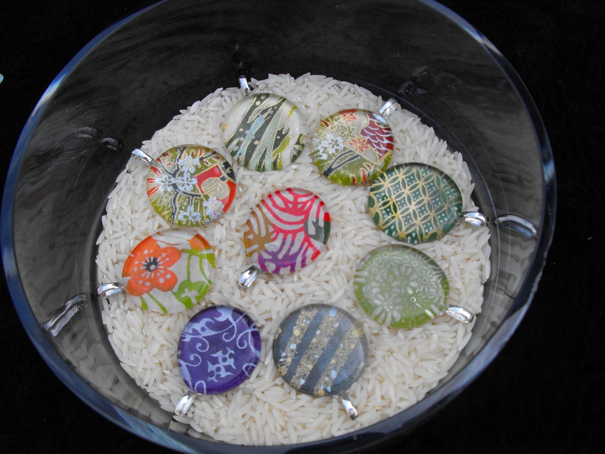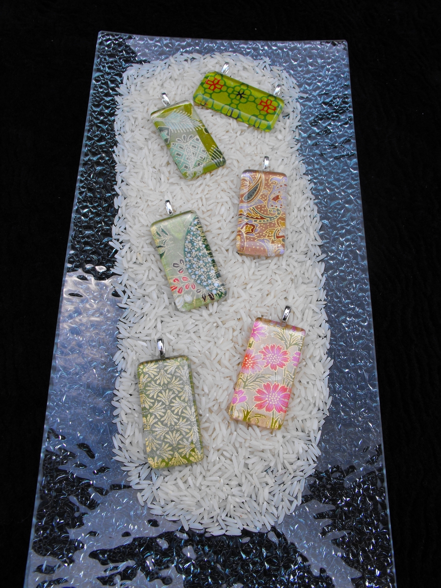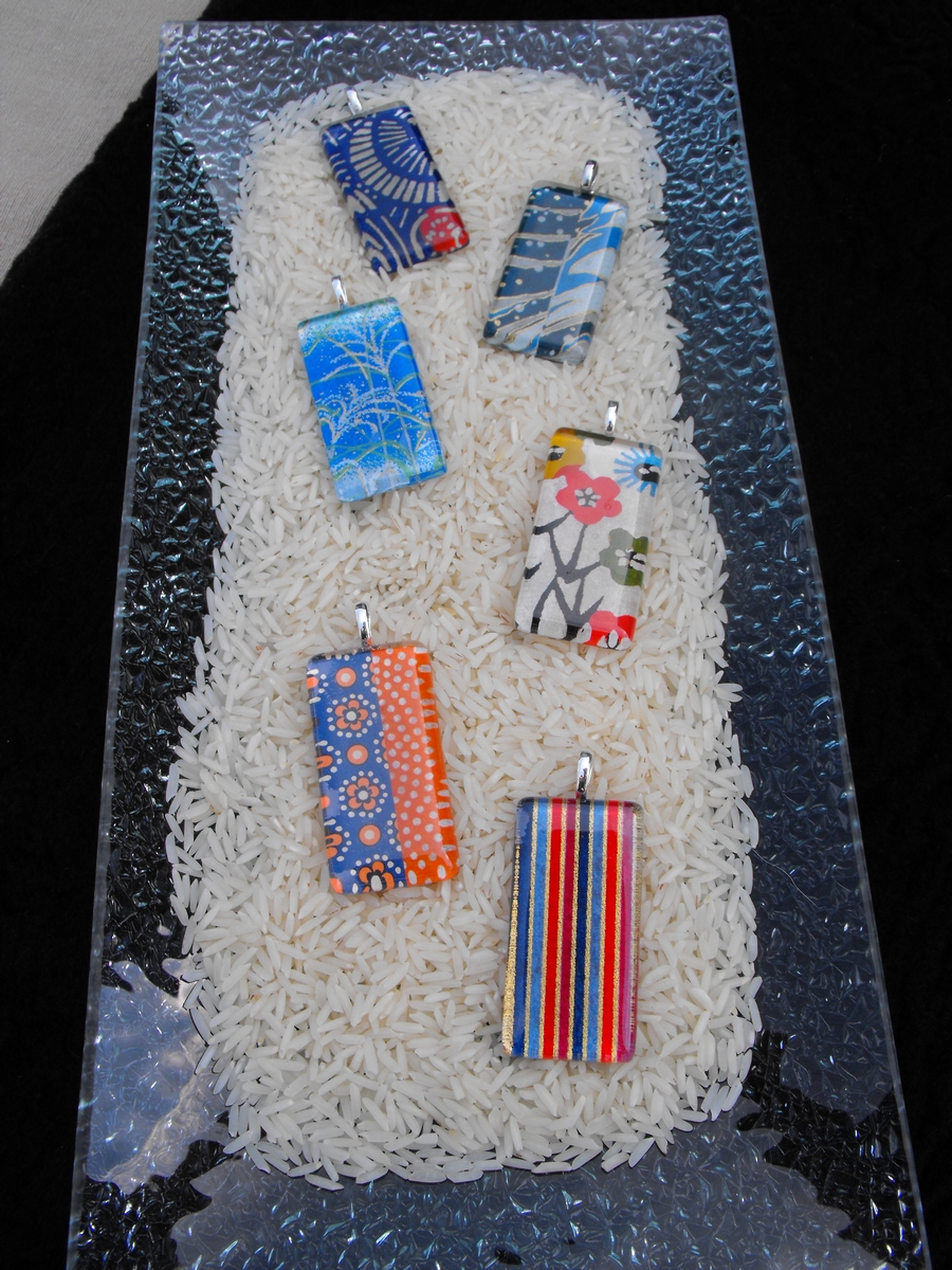 Japanese paper under glass tile pendants. For $20 you purchase a little piece of wearable art, and that includes a silver plated snake chain!