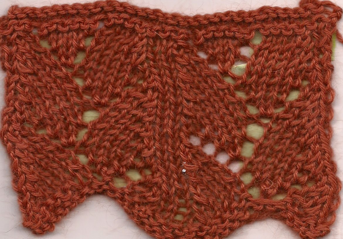 Row 11: K2, k2 tog, k3, yo, k5, yo, sl 1, k1, psso, k2*, rep *to*