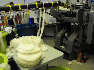 A single ply wound on a bobbin sits ready in the machine. Tours of the mill are possible but you must call to request. |